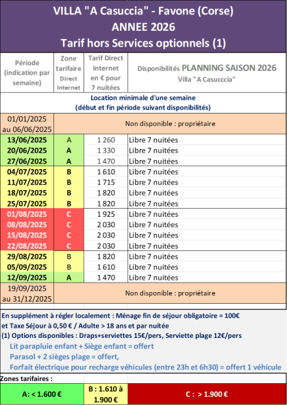Réservation pour la location de la Villa (Résidence Sérénamore) située à Favone (Commune de Conca) en Corse du Sud (2A) :